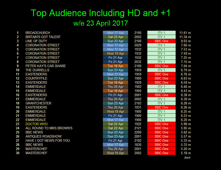 BARB TV Player reports: 137188/17th (w/e 23 Apr 17), 118501/20th (w/e 30 Apr 2017), 37546/97th (w/e 7 May 2017)
